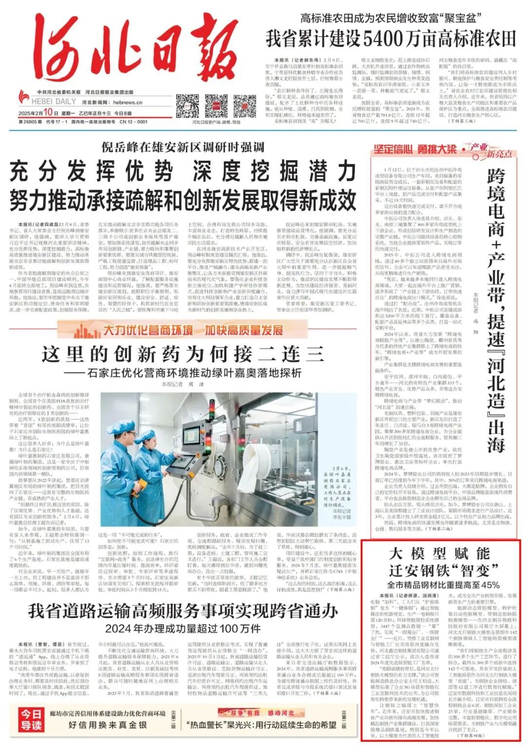 Recently, Hebei Daily published an article on the front page "Large model enables Qian 'an Steel" smart change "! The proportion of fine steel in the city increased to 45% ", focusing on Xinda smart factory and intelligent manufacturing scenarios with high promotion and application value, enabling the development of the steel industry. The article takes the 5G scenario and the application of intelligent industrial Internet technology in Hebei Xinda Iron and Steel Group Co., LTD., and deeply interprets what kind of "spark" the artificial intelligence technology represented by the large model in Qian 'an has collided with the steel industry.