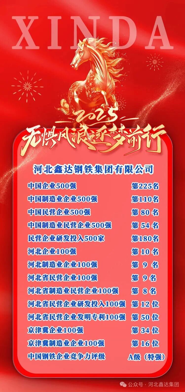 November: Hebei Xinda Iron and Steel Group Co., Ltd. ranked 10th on the 2025 Hebei Top 100 Enterprises list, 9th on the 2025 Hebei Top 100 Manufacturing Enterprises list, 34th on the 2025 Beijing-Tianjin-Hebei Top 100 Enterprises list, and 16th on the 2025 Beijing-Tianjin-Hebei Top 100 Manufacturing Enterprises list; was awarded the title of "National High-Quality Iron and Steel Production Enterprise", successfully passed the four-system certification audit, won many honors in Hebei Provincial Excellent Team Activities, and was rated as a "Hebei Provincial Benchmark Unit for Excellent Team Building Activities".